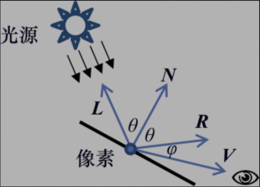 。 - 镜面光:与光源提供的镜面光强、材质的镜面反射参数、入射角(反射角)、观察方向有关。镜面光虽然不会随着入射角变大而变弱,但是会随着相机与反射光的夹角变大而变弱。