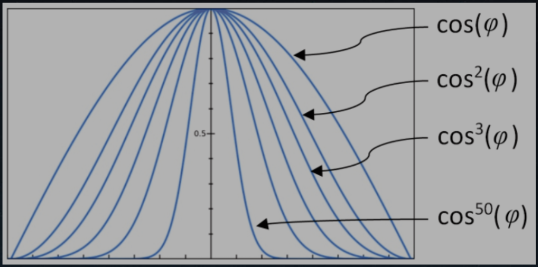 对于镜面反射,不同物体的 光泽度 又不同,随着光泽度的增加,镜面反射的现象应该变显著,反射的光会较少地逸散,当相机与反射光的夹角变大时,光强的衰减会变得明显。使用余弦的指数来作为镜面反射衰减的建模: