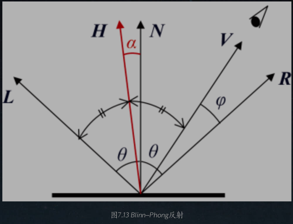 Blinn发现向量R在计算过程中并不是必需的——R只是用来计算角φ的手段。角φ的计算可以不使用向量R,而通过L与V的角平分线向量H得到。如图7.13所示,H和N之间的角α刚好等于1/2(φ)。虽然α与φ不同,但Blinn展示了使用α代替φ就已经可以获得足够好的结果